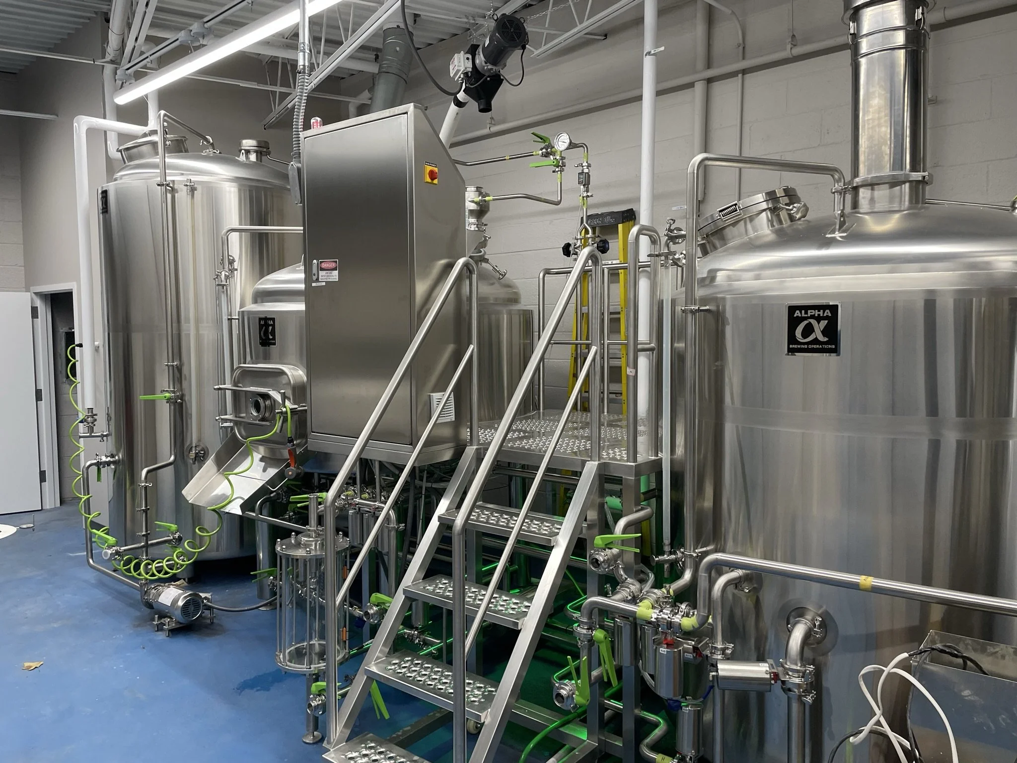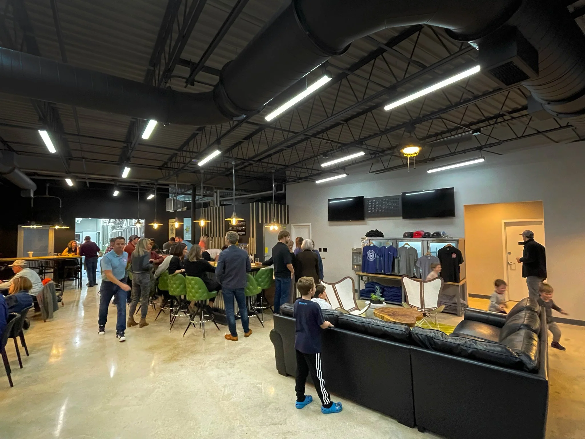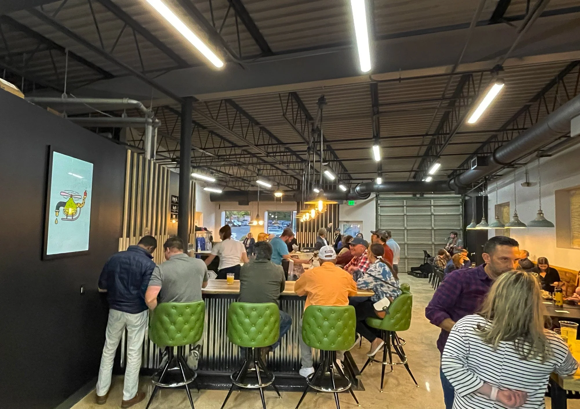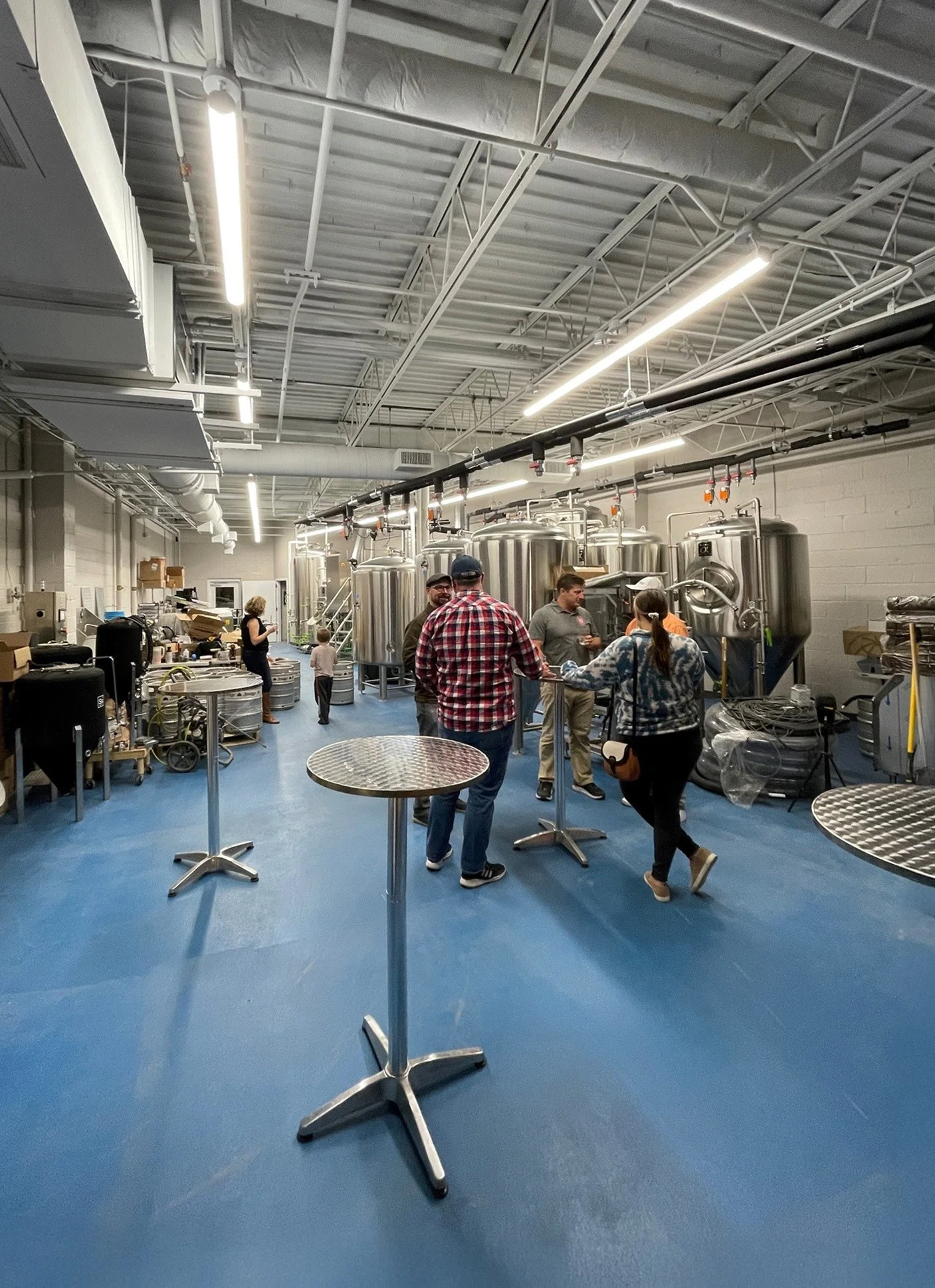 The brewery operates a 10-bbl brewing system with a dedicated tank farm, designed to accommodate future expansion into an adjacent tenant space once it becomes available. The Tasting Room occupies half of the interior, offering tables and chairs to support flexible seating. The space was intentionally sized for fewer than 100 occupants, allowing the project to avoid the need for fire sprinklers in the existing structure.
