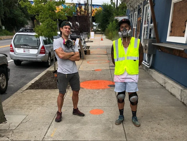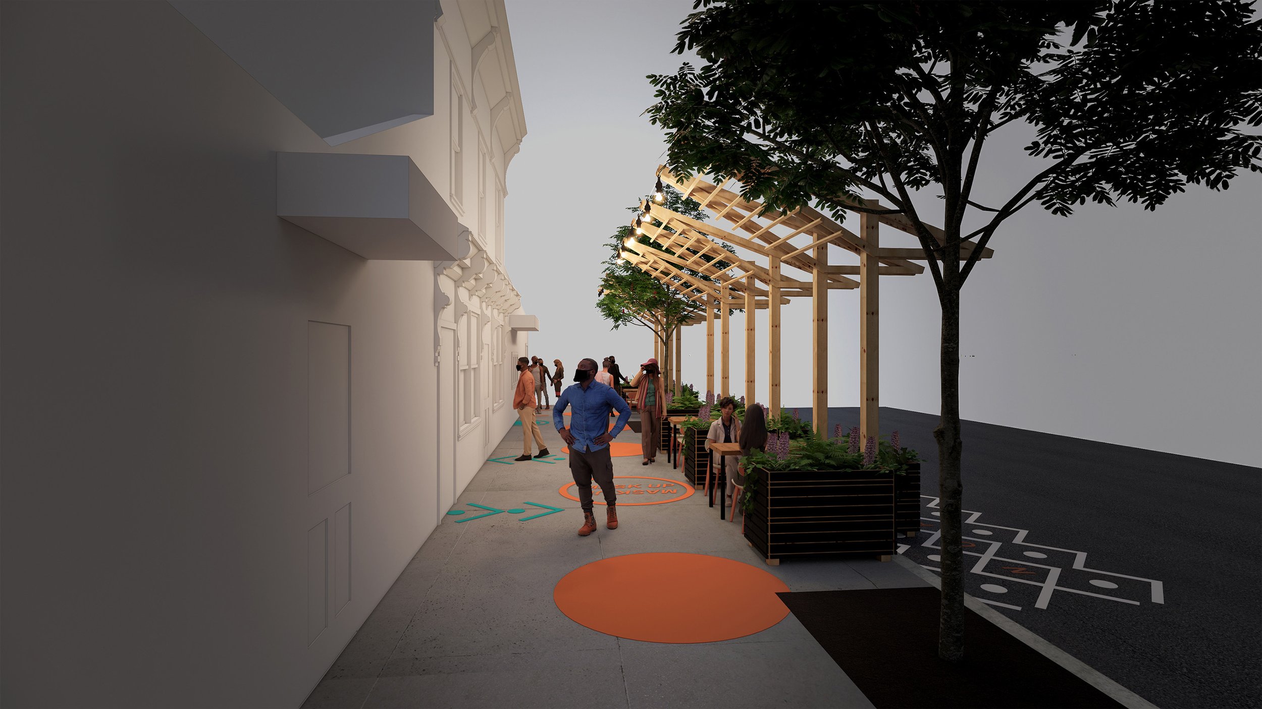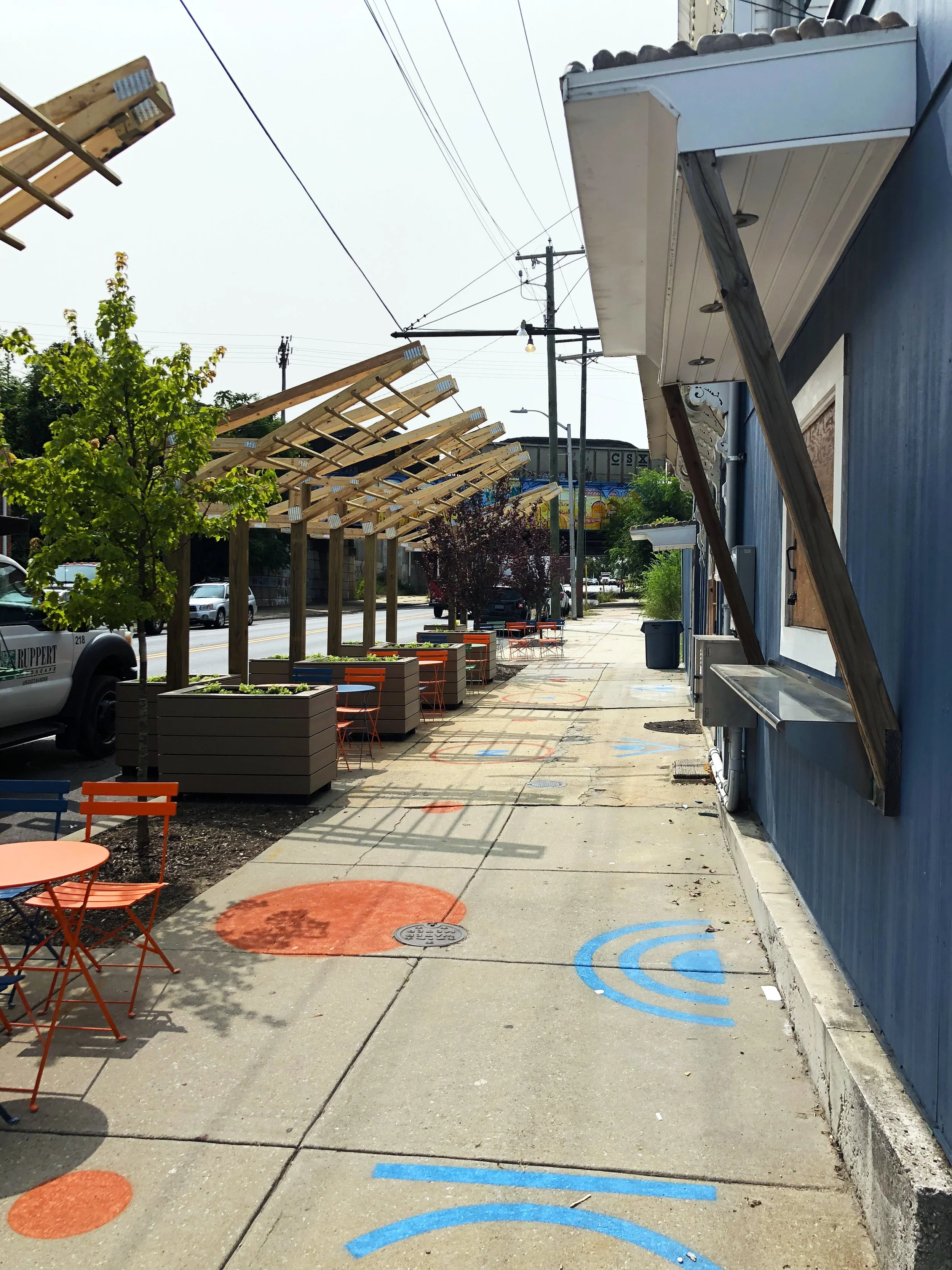 The Design for Distancing Program was part of a community initiative to bring architects and public health experts together during the COVID-19 pandemic to encourage the public to safely engage in their neighborhoods and provide strategies to implement public guidelines for social distancing. Twopoint Studio and Elite Construction were one of 17 teams selected to create installations in various City Districts. In partnership with the Greater Baybrook Alliance in the Brooklyn neighborhood of South Baltimore, a graphic design system was developed to promote social distancing, establish a unified identity for small restaurants affected by the loss of indoor restrictions, and foster safe gathering opportunities while supporting local businesses. The program was sponsored by the Mayor & City Council of Baltimore City, the Baltimore Development Corporation (BDC), and the Neighborhood Design Center (NDC).