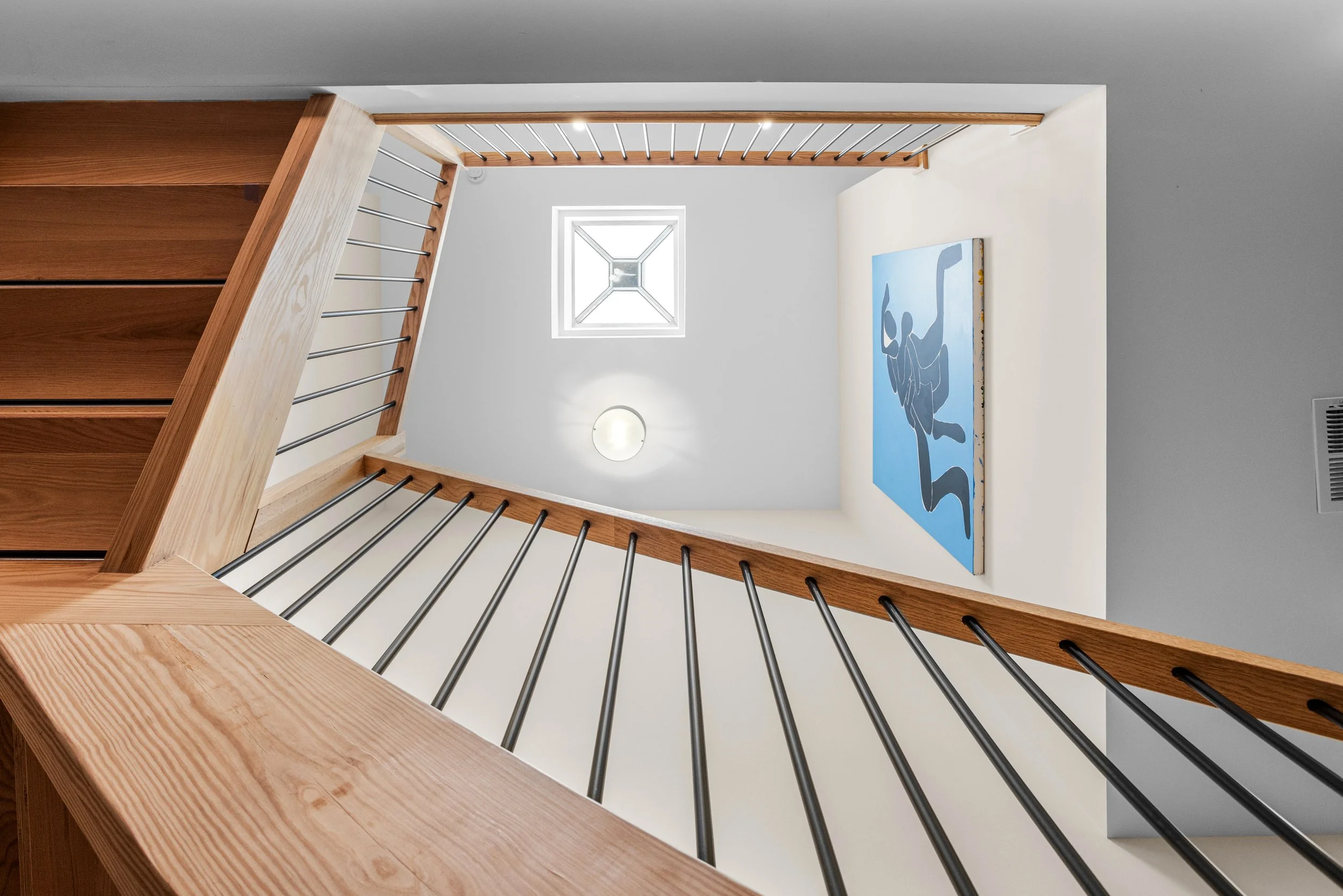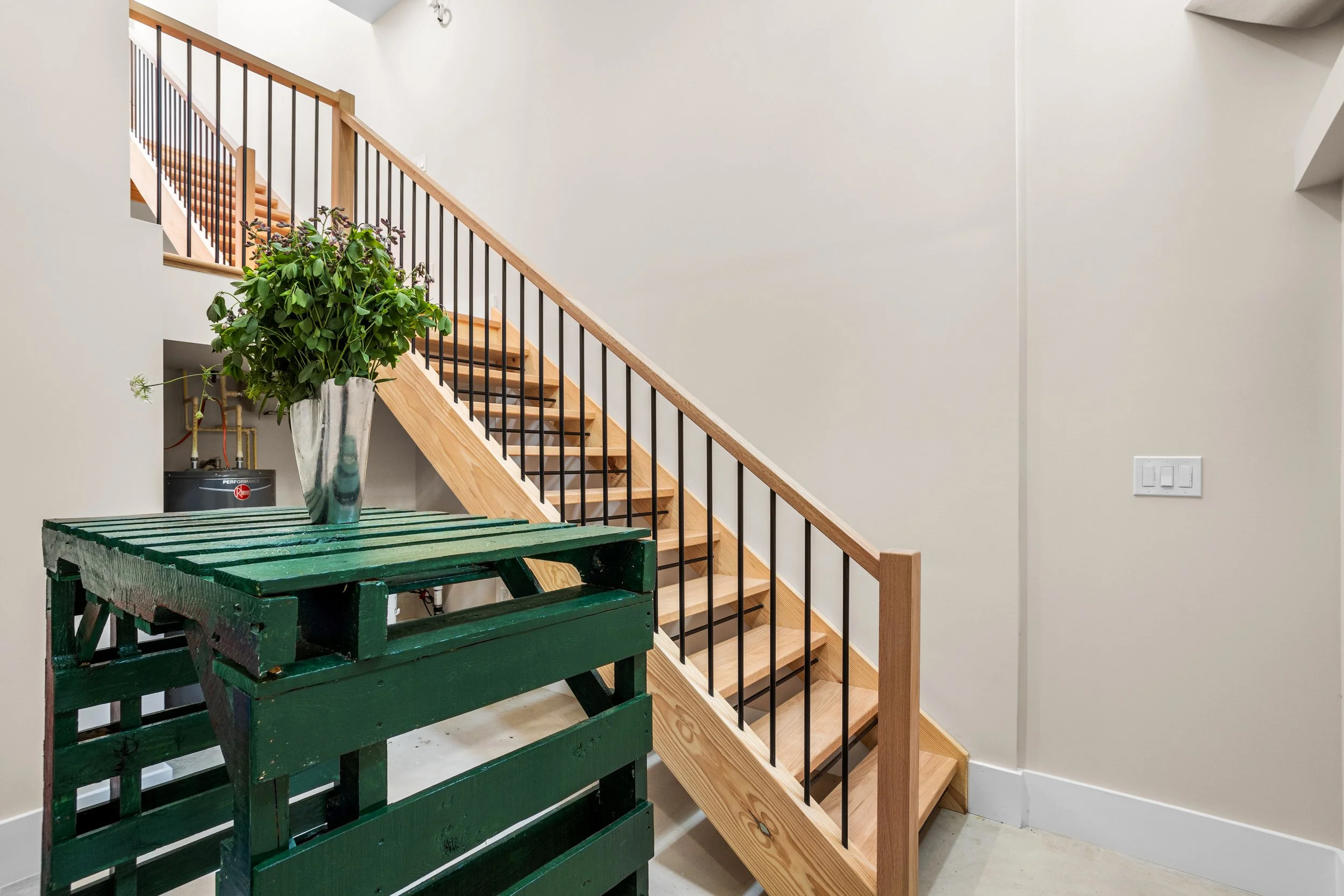 As 1620 McHenry is an end-of-the-block unit, Twopoint took advantage of the windows along the alley street to provide natural light-filled spaces. Double-height spaces become a source of inspiration for these artist homes. The studio and the living room use these large volumes to blend from one space to the next seamlessly. The designers used utility spaces original to the home, as functional artist studio space. One underlying characteristic of this prototype was that it allowed users to have a gallery on the main floor, open to the public.