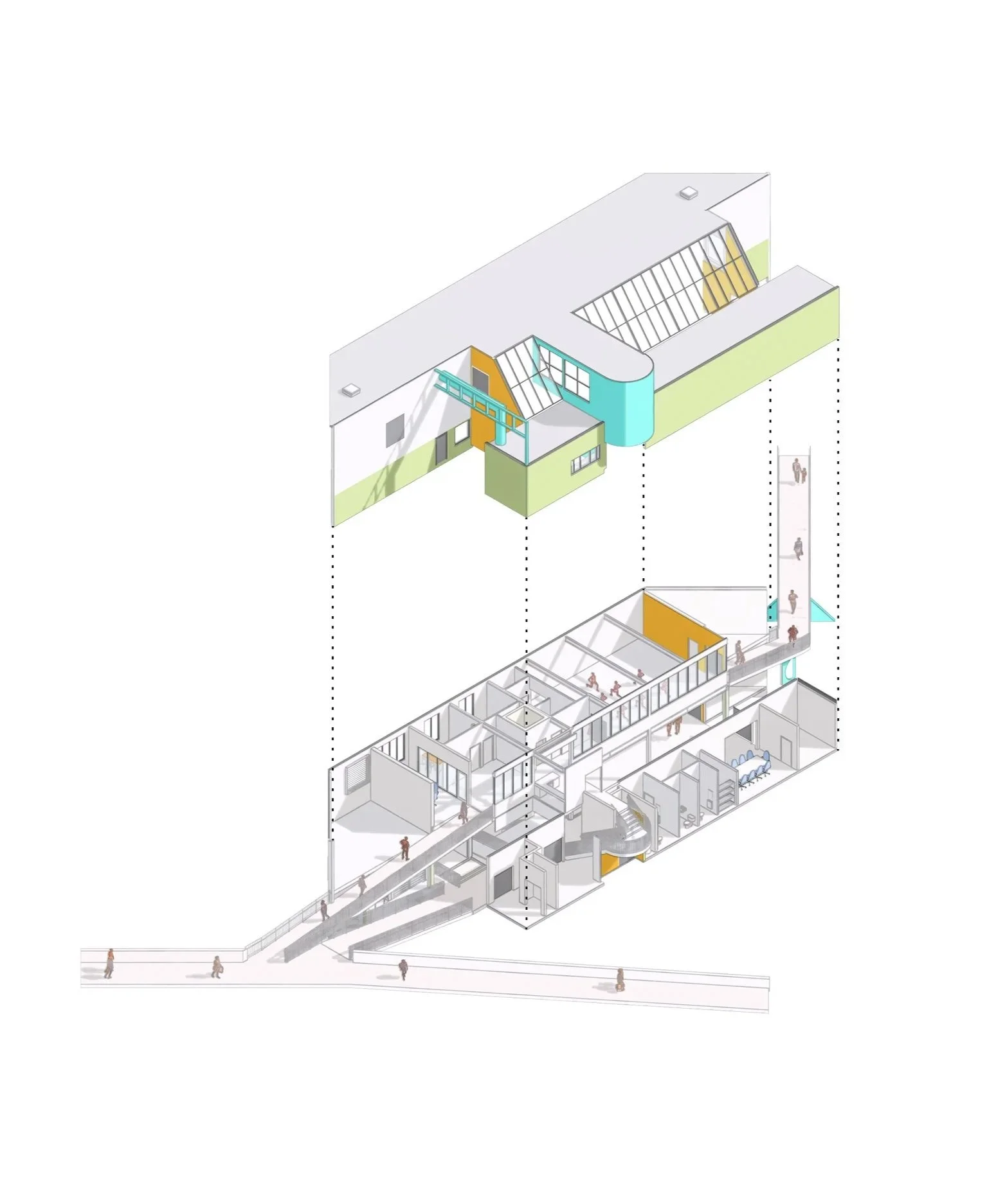 The design preserves the building’s distinctive identity—continuous ramps, exposed systems, and abundant daylight—while adapting it for contemporary needs. Upgrades include new mechanical, electrical, and plumbing systems, full ADA accessibility with an added elevator, and safer, more transparent circulation. Flexible interiors now support after-school programs, computer labs, fitness and dance classes, and community meetings, while maintaining access to the adjacent pool. Exterior colors selected by residents, along with local murals and restored supergraphics, reflect Poppleton’s history and aspirations.