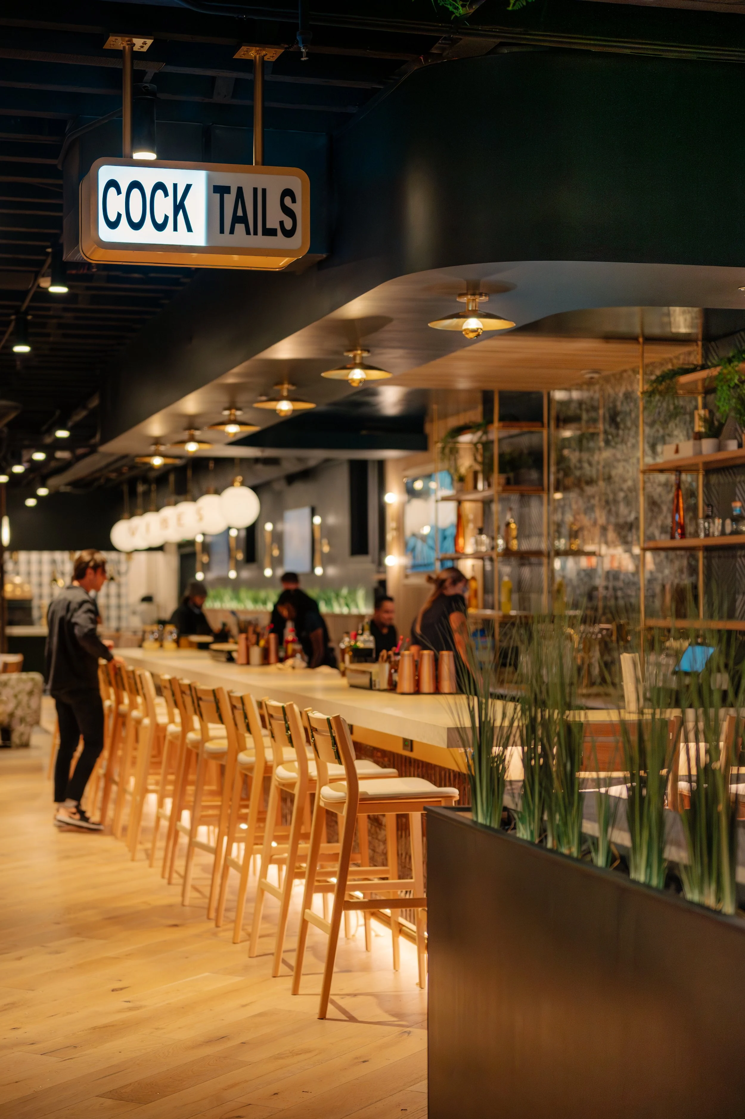 Inside, the design combines historical elements with fresh, dynamic features, balancing the preserved architecture and the restaurant’s lively ambiance. Diverse seating options are available, from swings near the entrance that connect diners to the energy of Thames Street, to cozy booths, upholstered stools, and plush lounge chairs further inside.