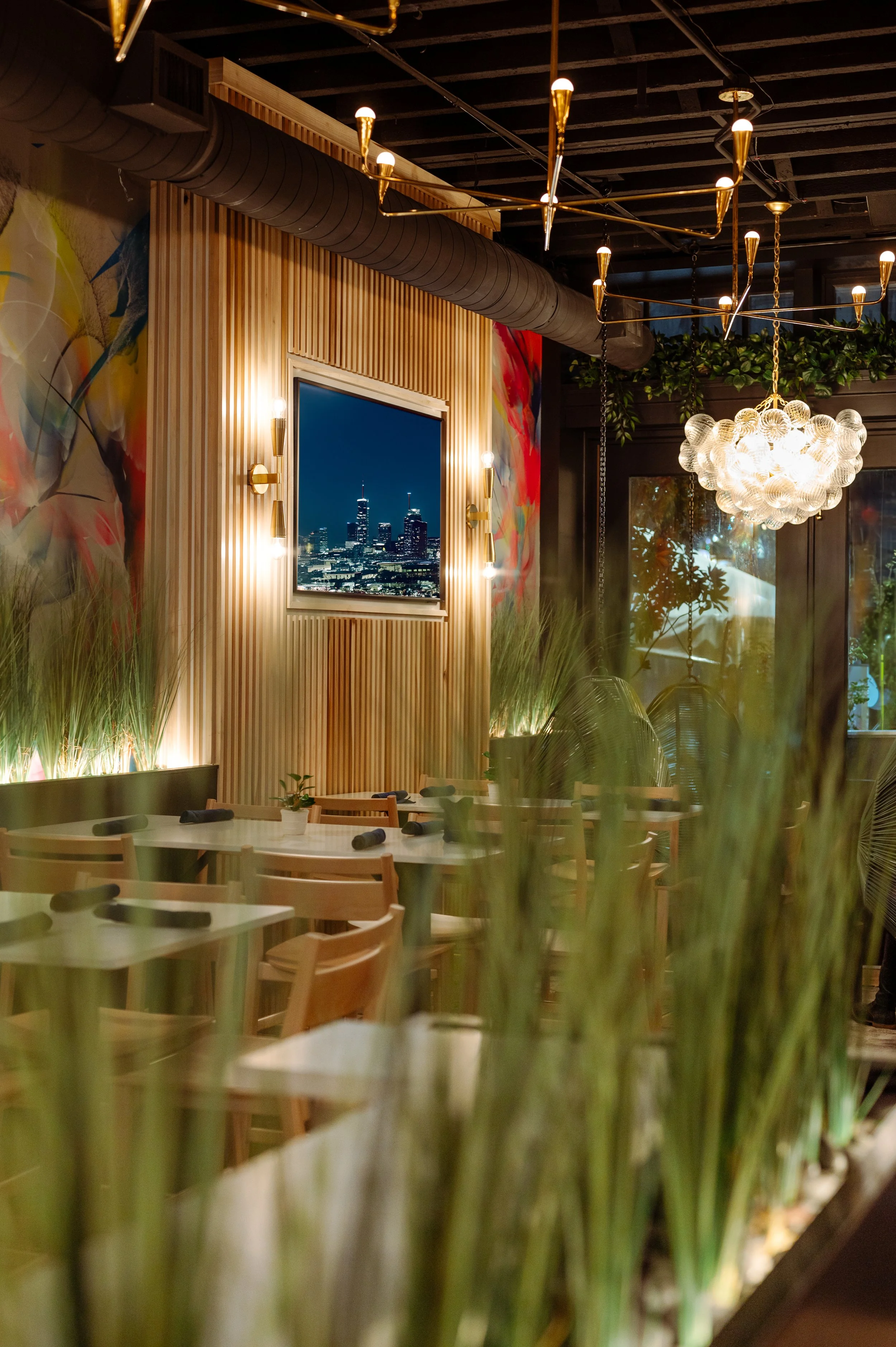 The client envisioned creating a space full of intrigue, reflected in bold lighting, whimsical signage, and unique artwork. At the same time, the design honors the building’s history, with repurposed horse stables now serving as dining booths. A custom ceiling made of rope and steel ties the space together, creating a striking focal point that blends heritage with modern flair.